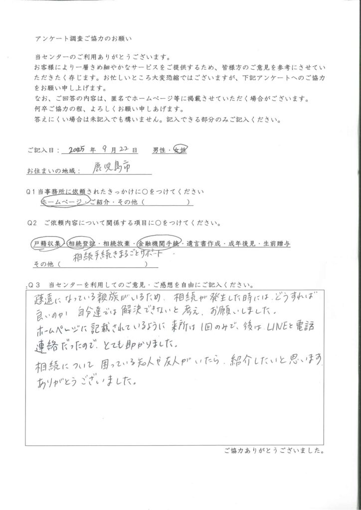 疎遠になっている親族がいるため、相続が発生した時にはどうすれば良いのか自分達では解決できないと考え、お願いしました。ホームページに記載されているように来所は1回のみで、後はLINEと電話連絡だったのでとても助かりました。相続について困っている知人や友人がいたら、紹介したいと思います。ありがとうございました。