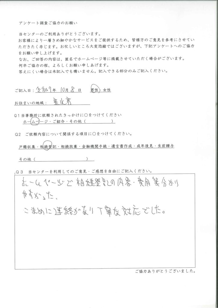 ホームページで相続登記の内容・費用等分かりやすかった。こまめに連絡があり丁寧な対応でした。