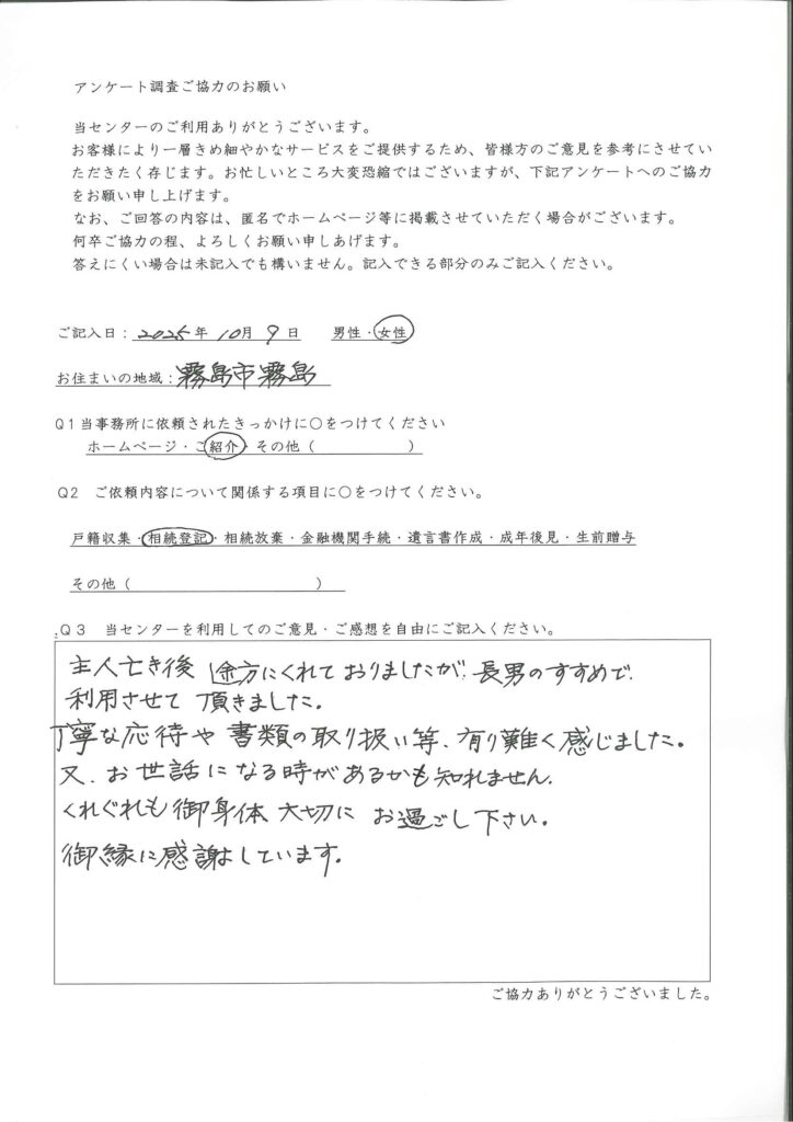 主人亡き後、途方にくれておりましたが、長男のすすめで利用させて頂きました。丁寧な応対や書類の取り扱い等、有り難く感じました。又、お世話になる時があるかも知れません。くれぐれも御身体大切にお過ごしください。御縁に感謝しています。