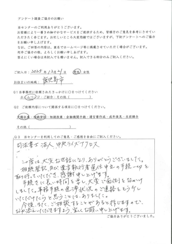 この度は、大変お世話になり、ありがとうございました。相続登記、及び、遺言執行者選任申立の手続一切を取り行っていただき、感謝申し上げます。手続に長い時間を要し、大変ご面倒をおかけしました。事務手続の進捗状況のご連絡をもう少しいただけてたらと思うことは、ありました。今後、また、ご相談をすることがあると存じますので、お力添えいただきますよう、宜しくお願い申しあげます。