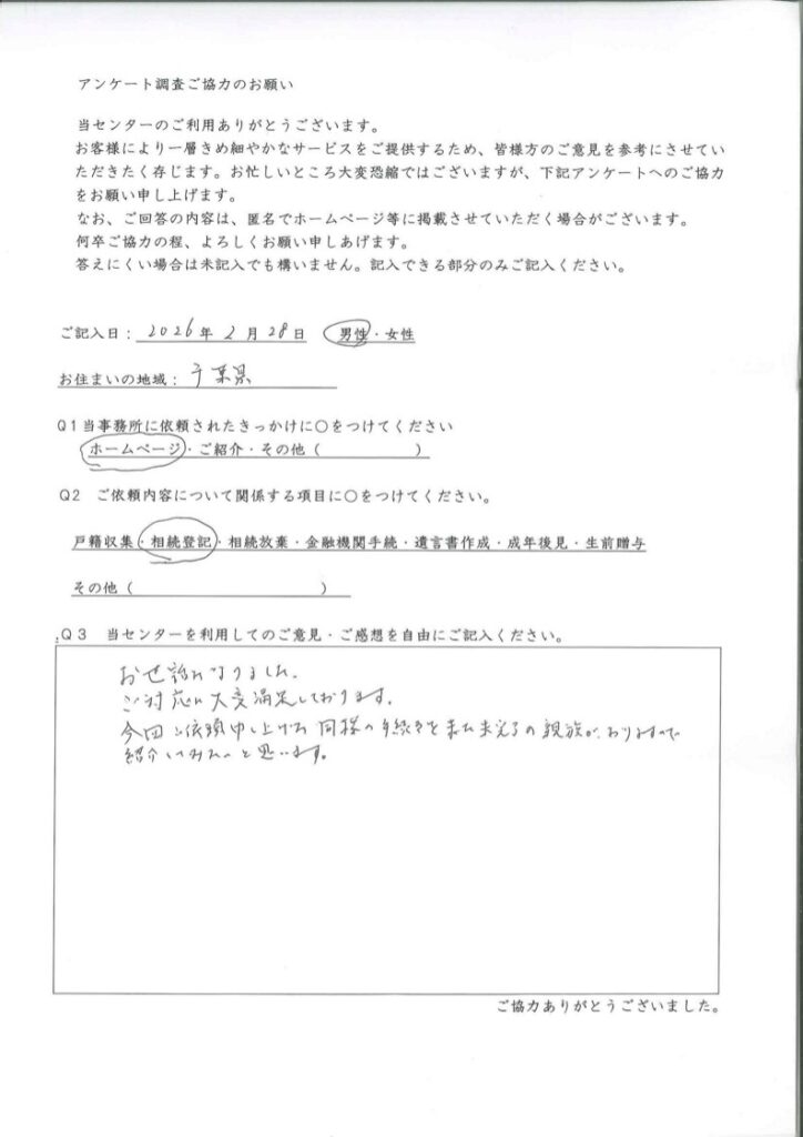 お世話になりました。ご対応に大変満足しております。今回ご依頼申し上げた同様の手続きを未だ未完了の親族が、おりますので紹介してみたいと思います。
